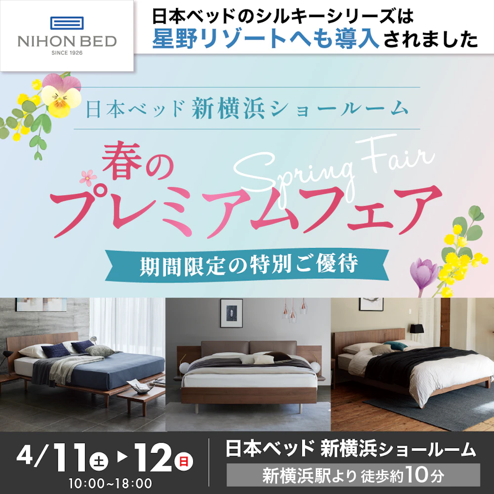 | 開催場所 | カリモク家具新横浜ショールーム4階内 日本ベッド 新横浜ショールーム (〒222-0033 神奈川県横浜市港北区新横浜1-12-6) |
