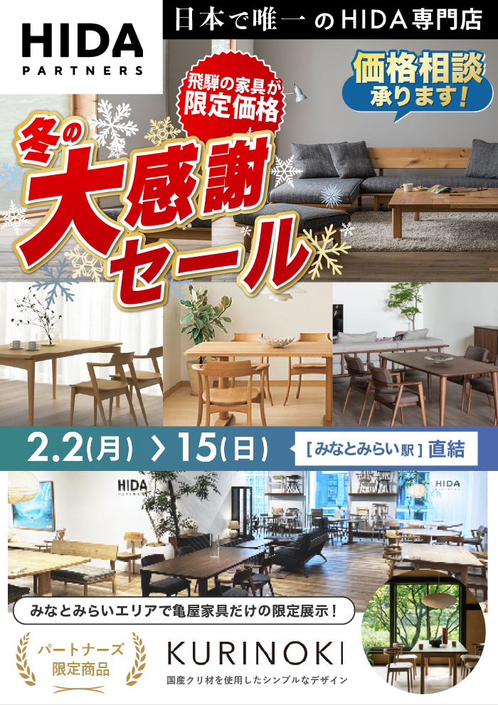 | 開催場所 | HIDA PARTNERS 亀屋家具 ギャラリー みなとみらい店(HIDA専門店) |